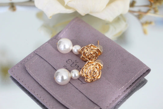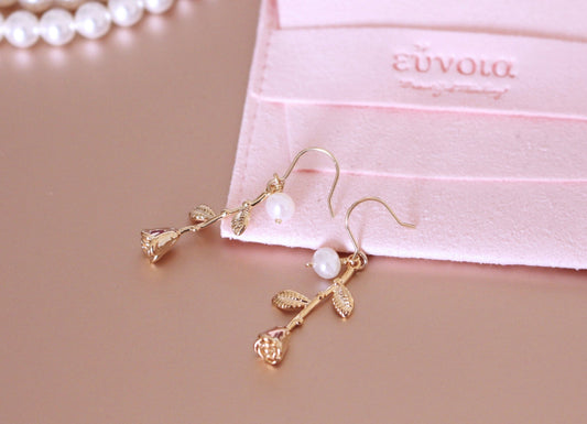 Cute 14k Gold & Pearl Statement Earrings w. Rose Stalk | Minimalist Chic