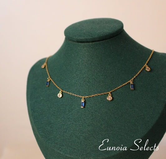 Ivy Sapphire Blue Necklace Dainty Dangle Charms w. 18K Gold Plated Chain