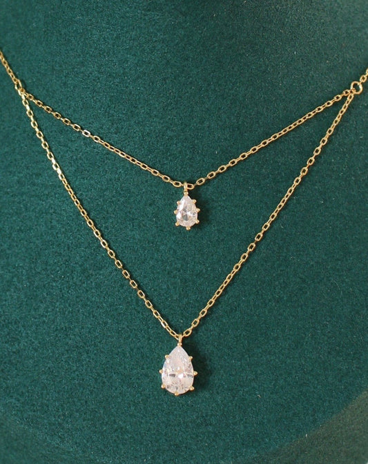 Lily Dual Pendant Necklace, S925 Silver Chain w. Teardrop Cubic Zirconia